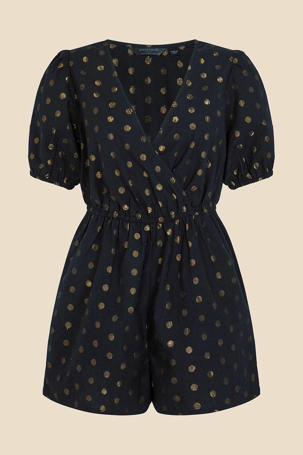Jetting off to the sunny coast? This playsuit’s dobby fabrication makes it extra breathable for trips to and from the hotel bar. It’s crafted in a wrap style on the bodice, with an elasticated waistline, making it super easy to slip on and off for spontaneous dips in the pool. Finished with a gold foil spot design.