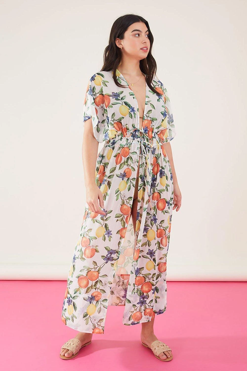 A luxurious topper to your black swimsuit, this kimono boasts our citrus-inspired print of the summer – featuring oranges and lemons. Tying through the centre of the bodice with three adjustable ties, it’s built with a v-neck and relaxed sleeves.