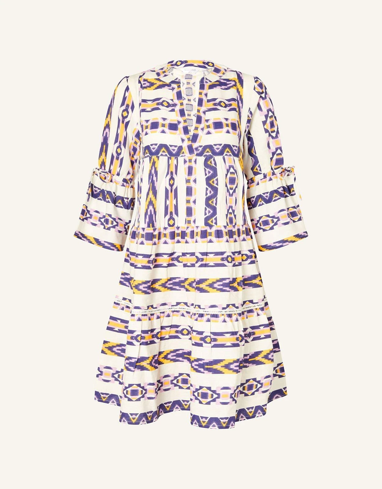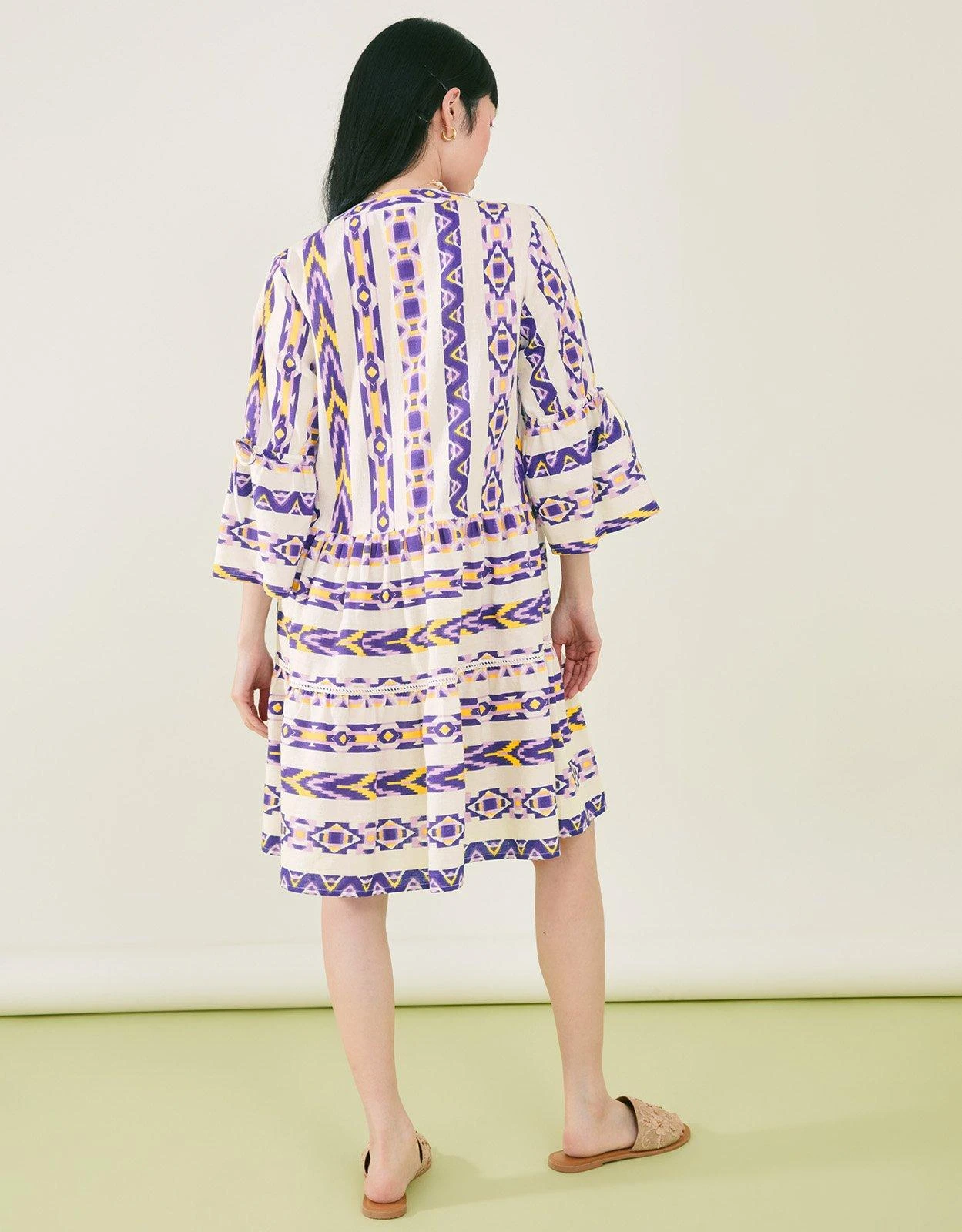 A complementary yellow and purple geometric pattern parades through this jacquard dress. Finished with cropped flute sleeves and tiers through the skirt, it’s a feminine option for dinners by the sea.