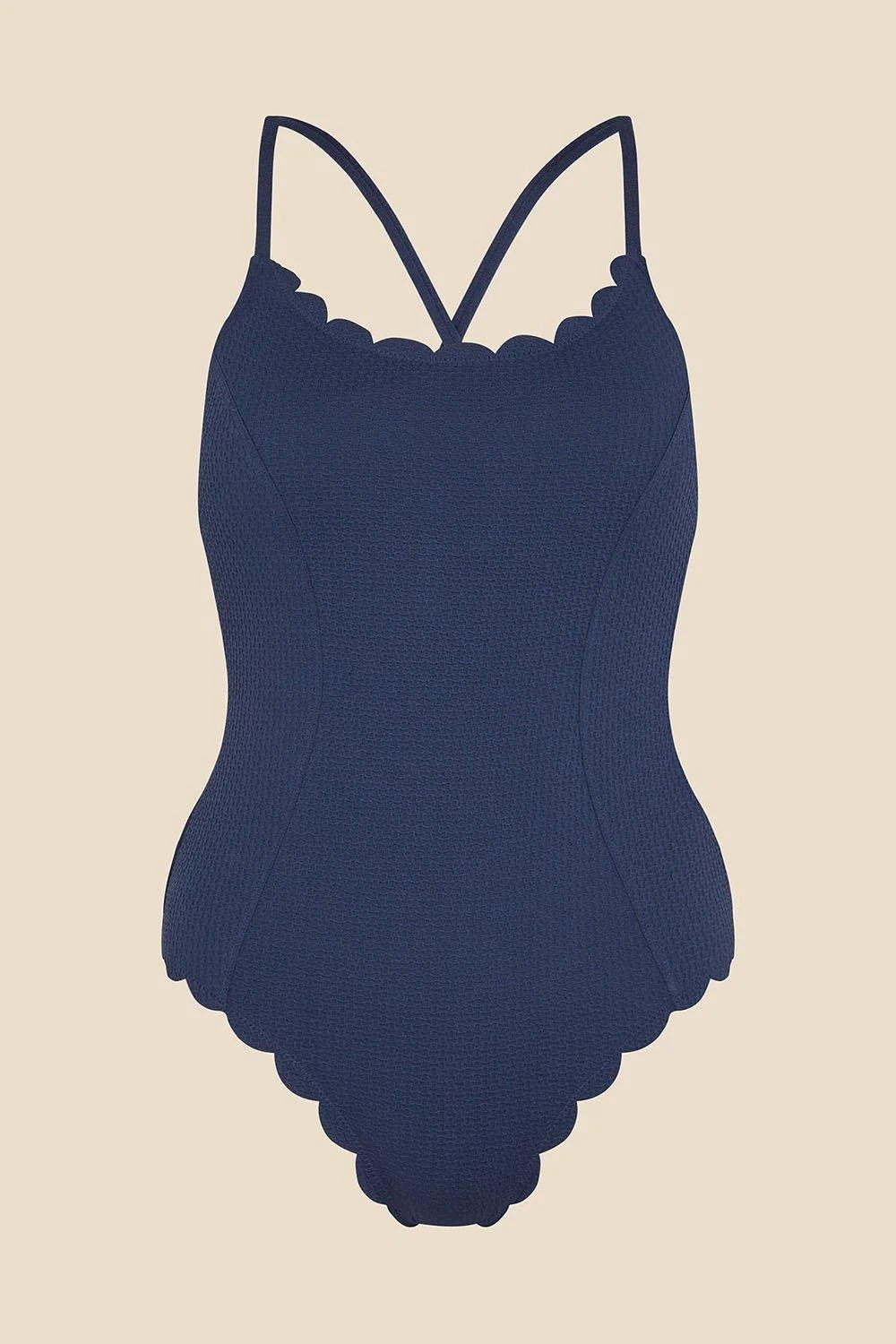 Perfect for sandy shores and sipping cocktails, this swimsuit is designed in textured fabric for a flattering fit. It features scalloped trims throughout, with a scooped neckline and cross-strap detailing to the back. Style it with your best kaftan and strappy sandals for a look that’s ready for the beach bar.