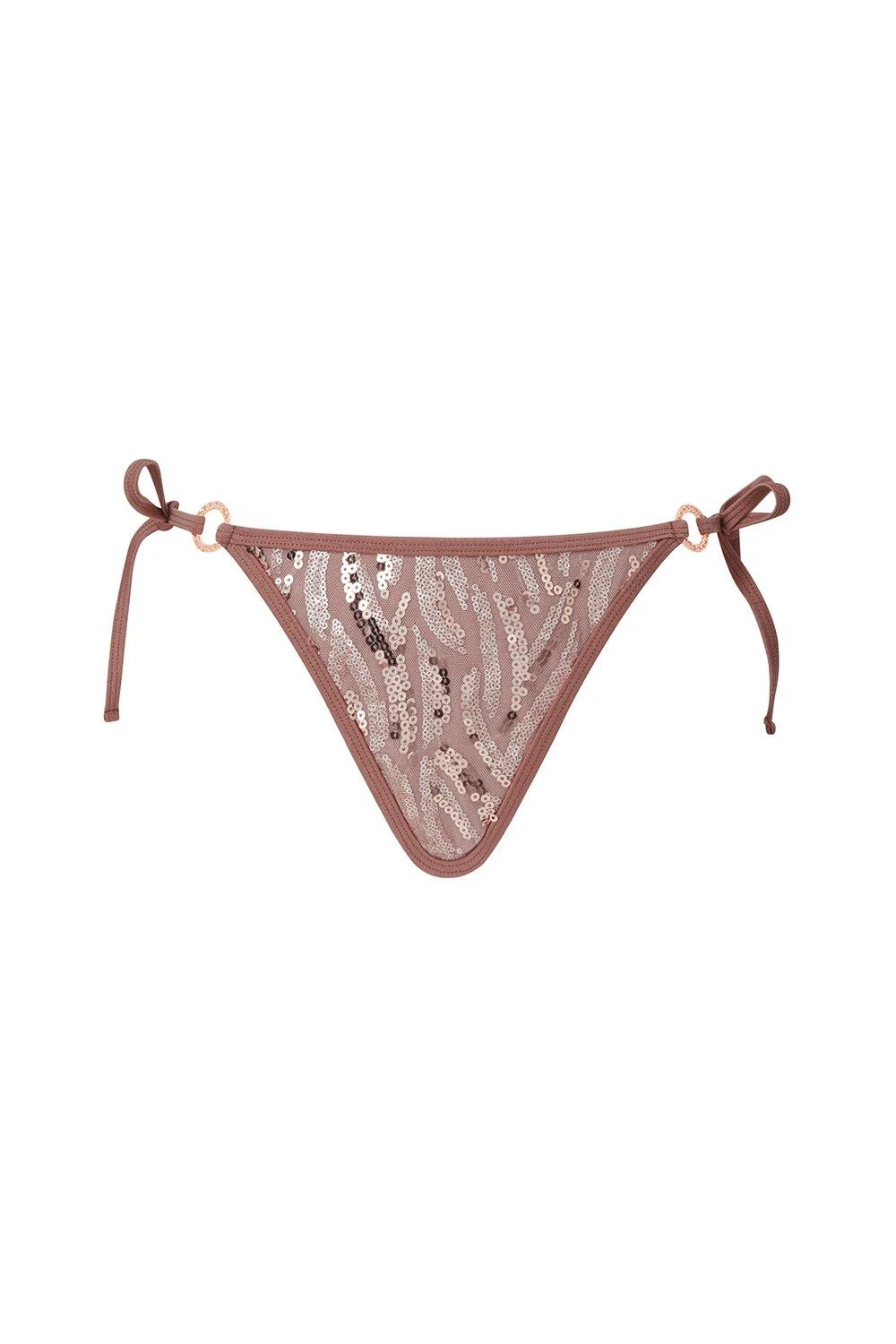 Turn heads in our Gold Coast Brazilian Tie Side. Made from dazzling multi-tonal zebra sequinned fabric, it is cut to a low rise Brazilian Bum Coverage with hardware detail at the hips and tie up side straps for a comfortable fit. Pair yours with the matching Gold Coast collection for a chic poolside look.