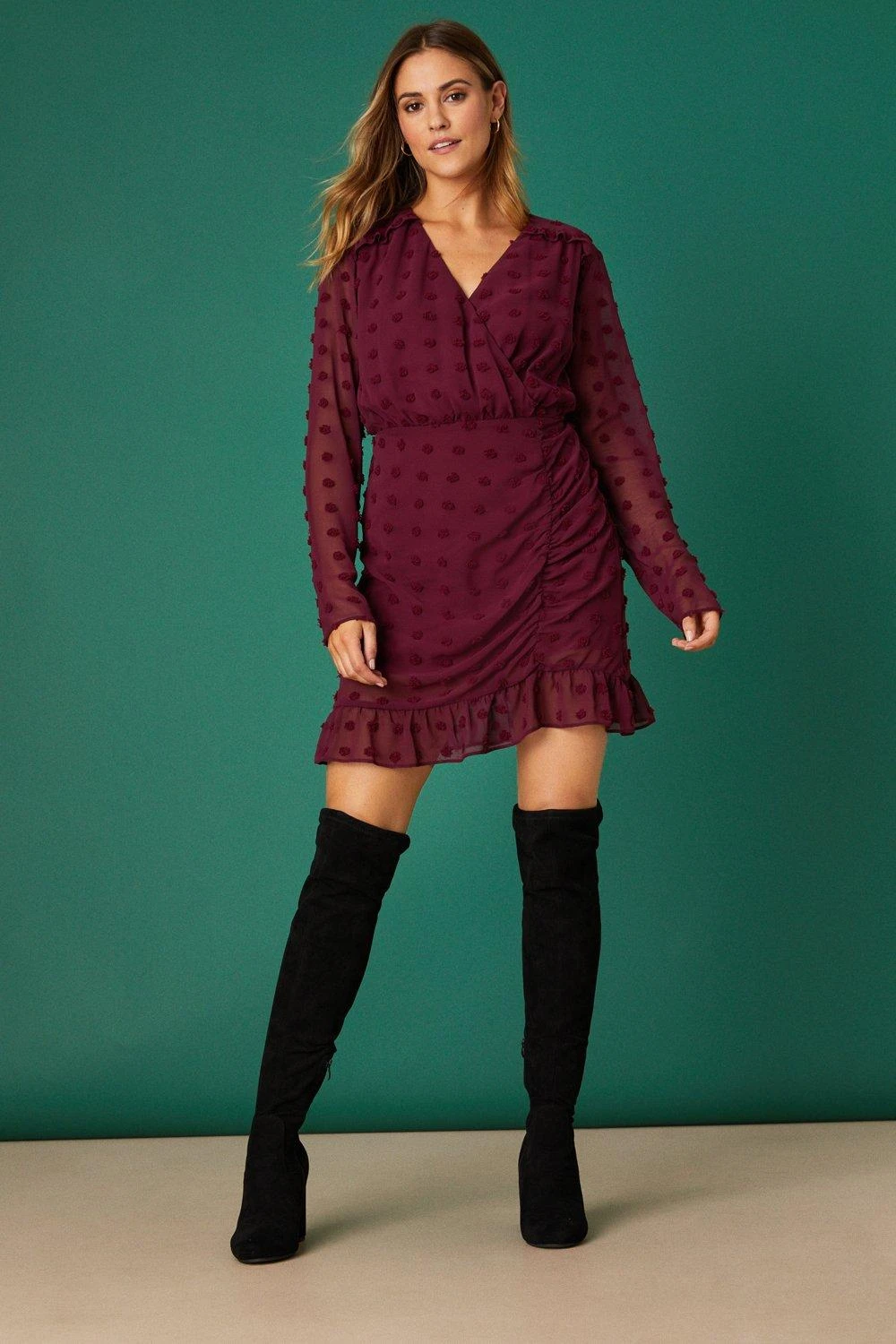 Part of our second edit with singer, presenter, and certified fashionista, Kimberley Walsh. Inspired by you, we’ve mixed glam statement separates, bold prints and bright pops of colour with autumn’s favourite essentials. Embrace the very best of the season in non-traditional layering and versatile pieces you’ll love now and wear forever.You’ve got the plans, we’ve got the dresses. From midi dresses to maxi dresses, bridesmaid dresses and everything in between, we’ve got you covered for every event in the social calendar. Whether you’re after occasionwear for a special event or updating your work attire with a simple shirt dress, you’ll find a range of amazing styles and silhouettes at DP. Style: Berry Chiffon Dobby Ruched Wrap Mini DressLength: Approx. 90cmFit: Fit And FlareIdeal for: DaywearDesign: Wrap