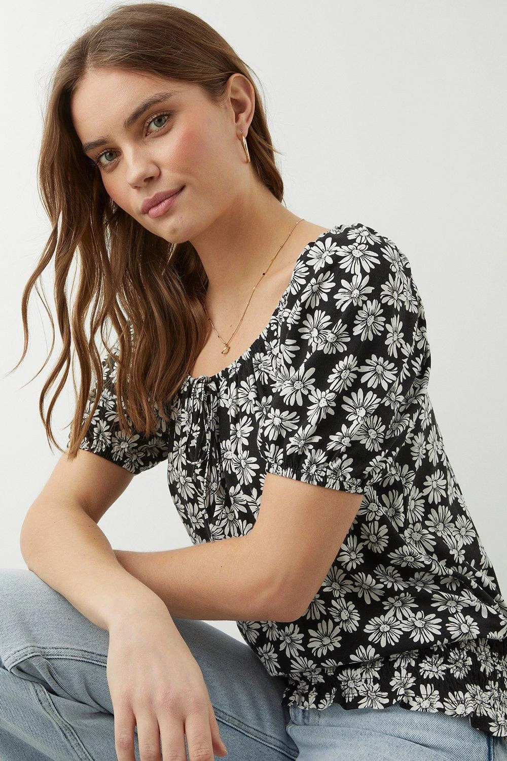Cami or blouse? Shirt or bodysuit? Whatever you’re after, our women’s tops have you covered for every event in the social calendar. From casual fits to elevated styles for special occasions, we make it easy to nail the ‘jeans and a nice top’ look. Think puff sleeves, pretty prints, wrap silhouettes and so much more.Style: Black Ditsy Shirred Hem Tie Detail Short Sleeve Top Length: Approx. 64cm Fit: Regular Ideal for: DaywearDesign: Shirred Make-up & Fragrance: Primer (Estée Lauder, The Mattifier Shine Control Perfecting Primer + Finisher), Foundation (Lancôme, Teint Miracle Luminous Satin Foundation), Mascara (Estée Lauder, Double Wear Zero-Smudge Lengthening Mascara), Blusher (Benefit, Wanderful World Blushes Starlaa Rosy Bronze Powder Blusher), Setting Spray (Benefit, Porefessional Super Setter Setting Spray Mini 30ml), Fragrance (Elie Saab, Elixir).