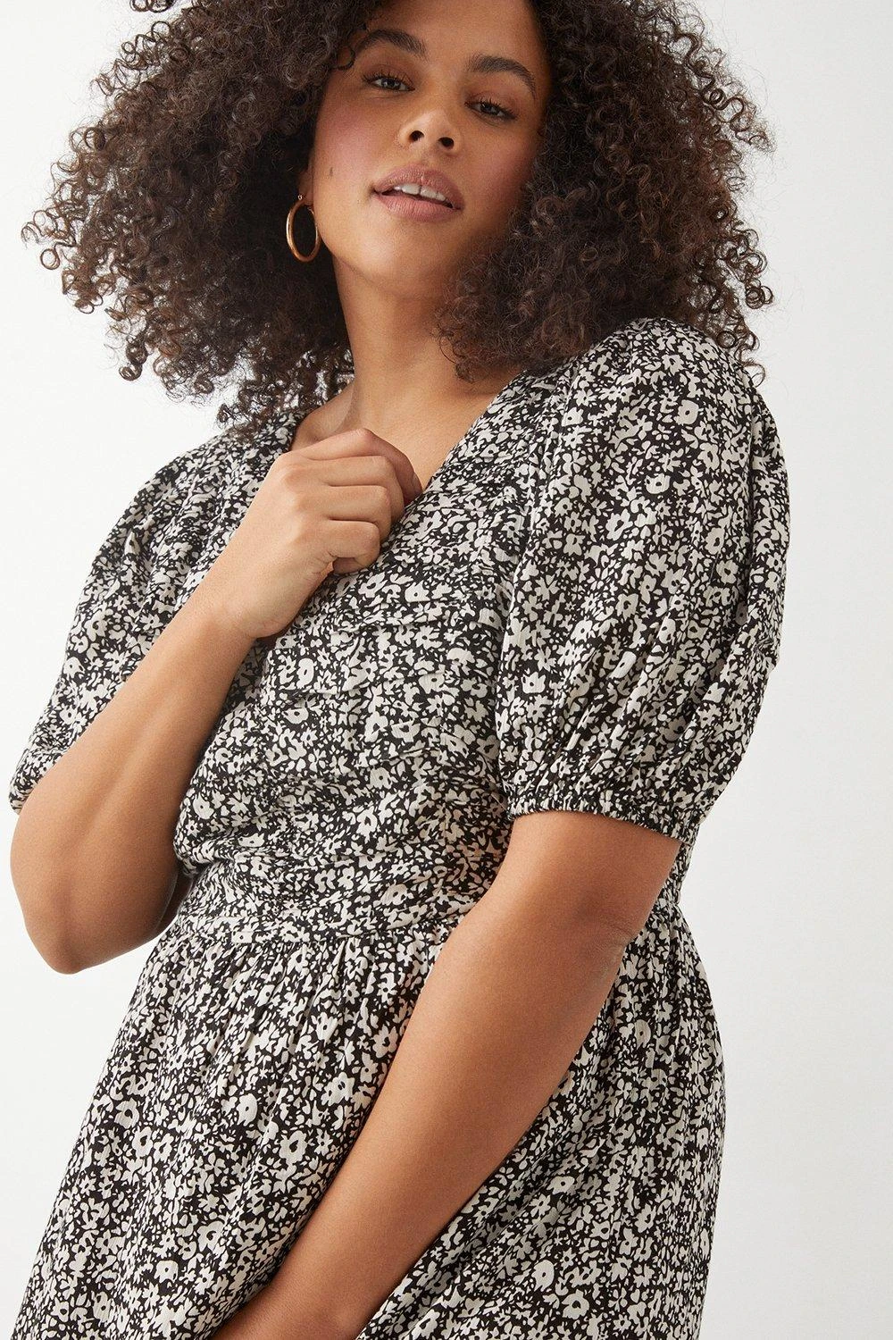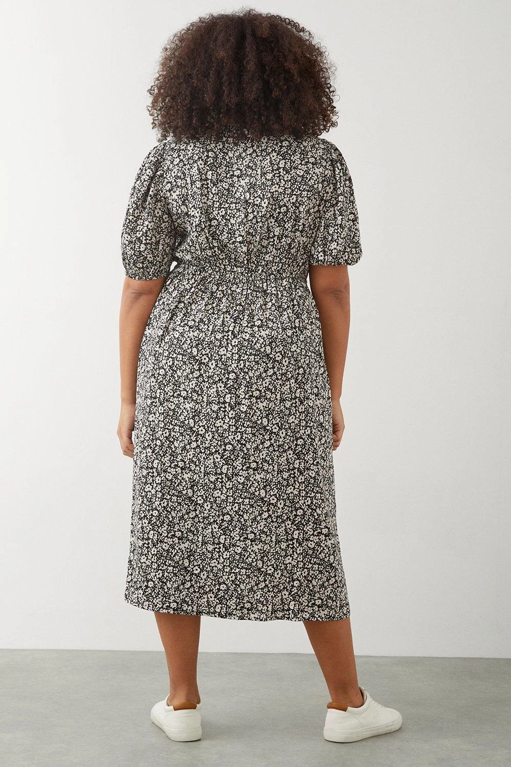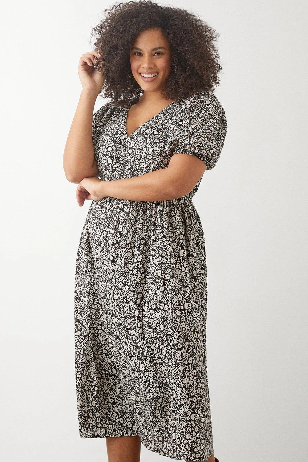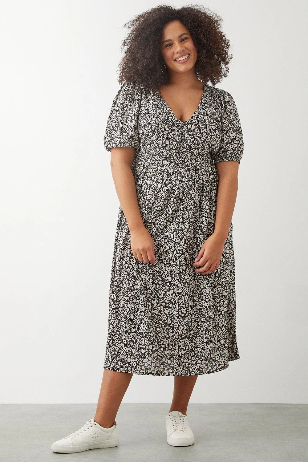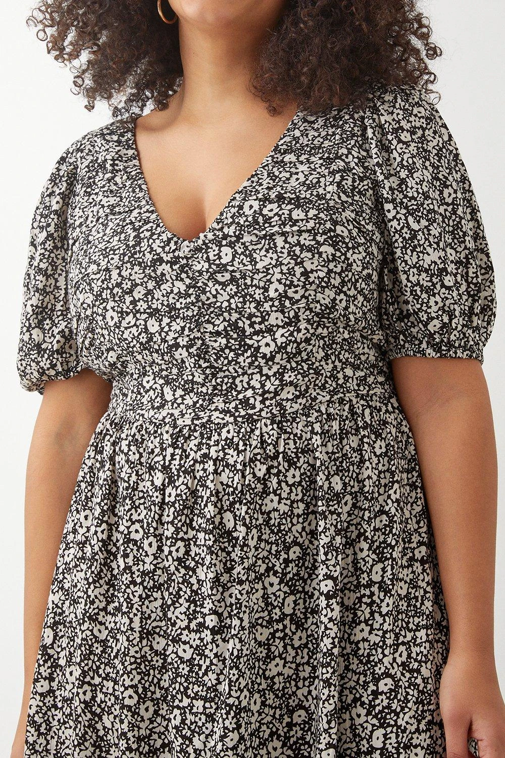 Dorothy Perkins Curve Mono Ditsy Crinkle Ruched Front Midi Dress
