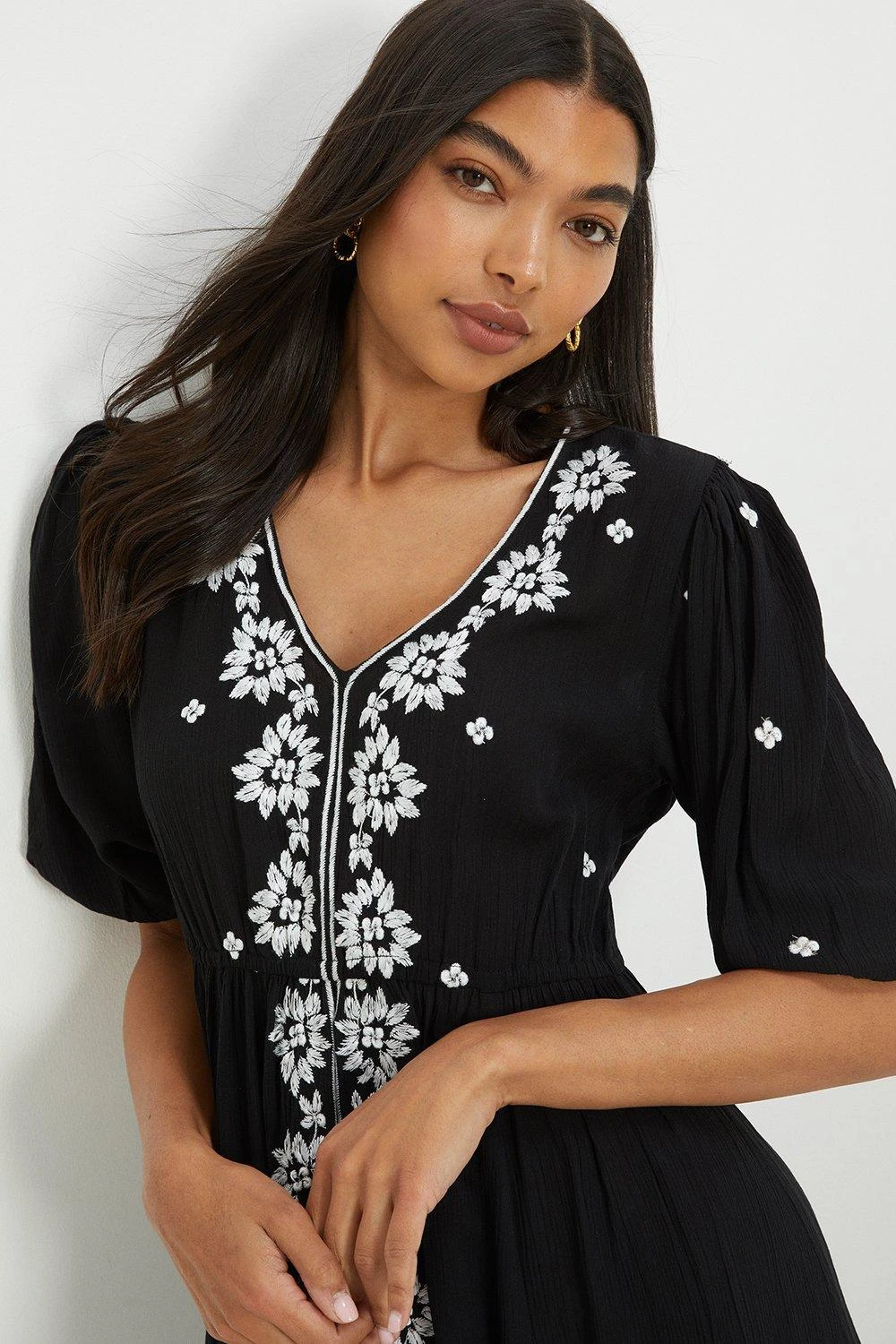 You’ve got the plans, we’ve got the dresses. From midi dresses to maxi dresses, bridesmaid dresses and everything in between, we’ve got you covered for every event in the social calendar. Whether you’re after occasionwear for a special event or updating your work attire with a simple shirt dress, you’ll find a range of amazing styles and silhouettes at DP. Style: Embroidered V Neck Midi Dress. Ideal for: Daywear. Design: Puff Sleeve. Model wears size UK 10 and is 5′ 9″ tall. Make-up & Fragrance: Primer (Estée Lauder, The Mattifier Shine Control Perfecting Primer + Finisher), Foundation (Lancôme, Teint Miracle Luminous Satin Foundation), Mascara (Estée Lauder, Double Wear Zero-Smudge Lengthening Mascara), Blusher (Benefit, Wanderful World Blushes Starlaa Rosy Bronze Powder Blusher), Setting Spray (Benefit, Porefessional Super Setter Setting Spray Mini 30ml), Fragrance (Elie Saab, Elixir).