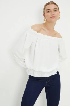 Cami or blouse? Shirt or bodysuit? Whatever you’re after, our women’s tops have you covered for every event in the social calendar. From casual fits to elevated styles for special occasions, we make it easy to nail the ‘jeans and a nice top’ look. Think puff sleeves, pretty prints, wrap silhouettes and so much more. Style: Ivory Shirred Bardot Top. Ideal for: Daywear. Fit: Relaxed. Design: Shirred. Made in the UK. Model wears size UK 10 and is 5′ 9″ tall. Make-up & Fragrance: Primer (Estée Lauder, Futurist Aqua Brilliance Watery Glow Primer), Foundation (Estée Lauder, Futurist Hydra Rescue Moisturizing Foundation SPF45), Bronzer (Benefit Hoola Matte Powder Bronzer), Mascara (Benefit, They’Re Real Lengthening Mascara Jet Black 8.5g), Setting Spray (Urban Decay, All Nighter Setting Spray 118ml), Fragrance (Jimmy Choo Eau De Parfum Signature).