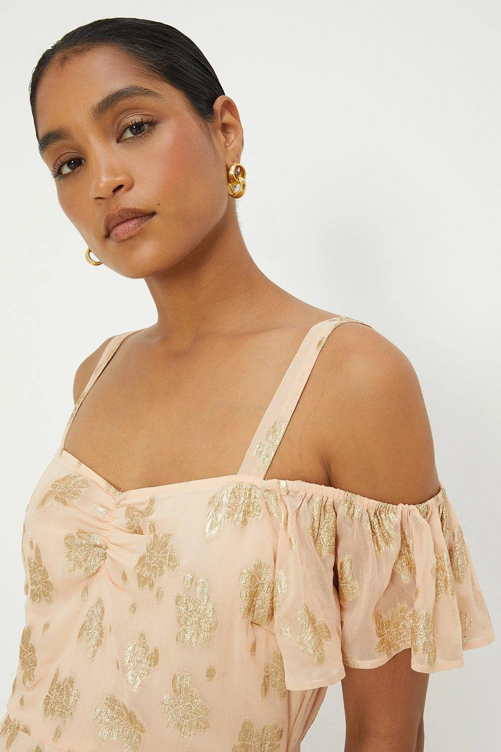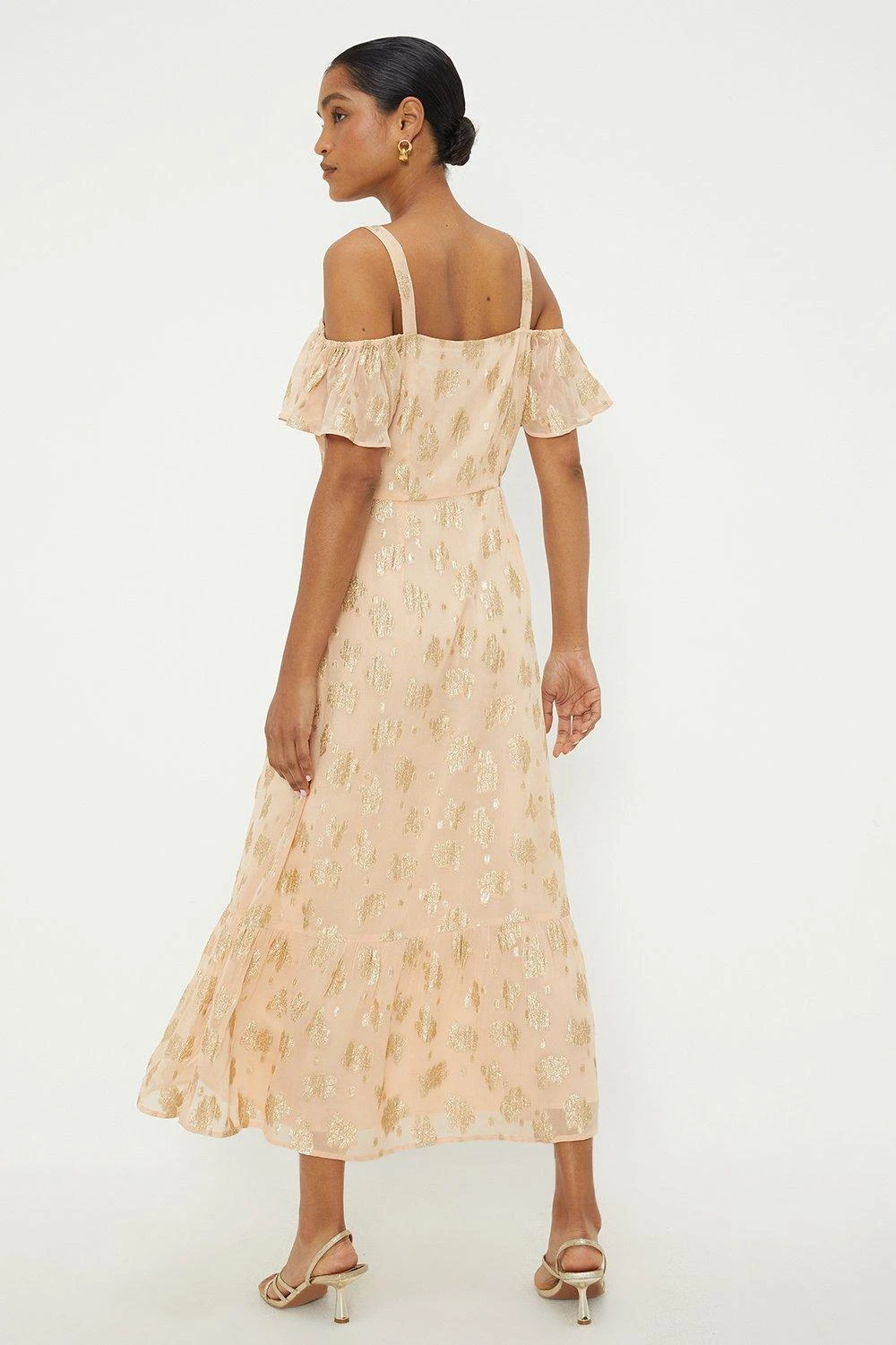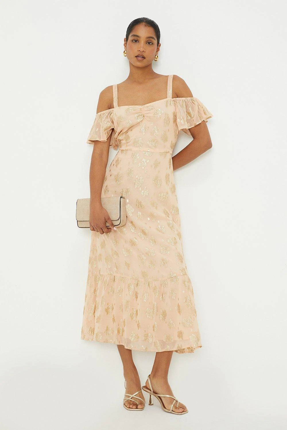 Dorothy Perkins Peach Metallic Jacquard Cold Shoulder Midi Dress
