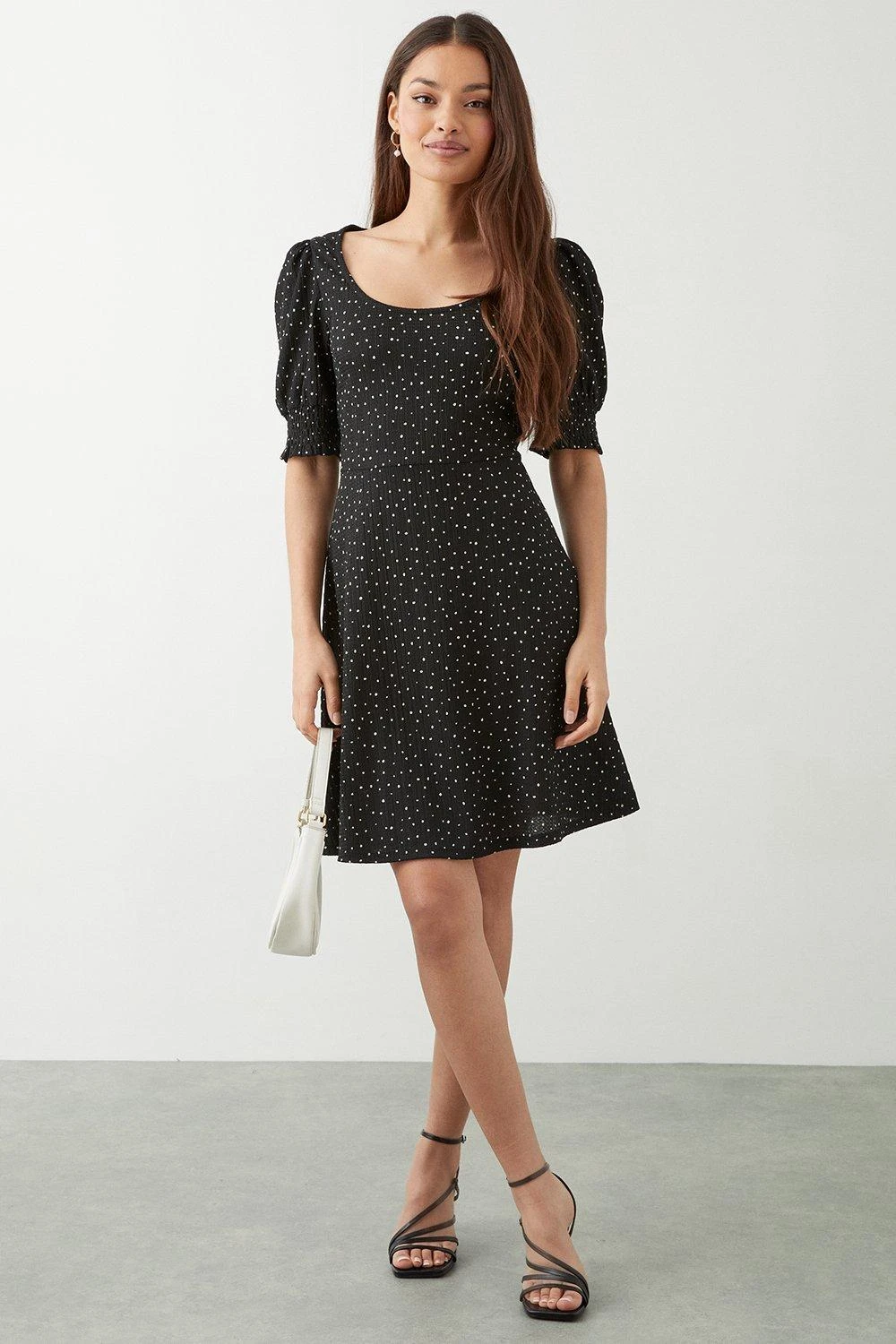 Dorothy Perkins Petite Mono Spot Shirred Cuff Mini Dress