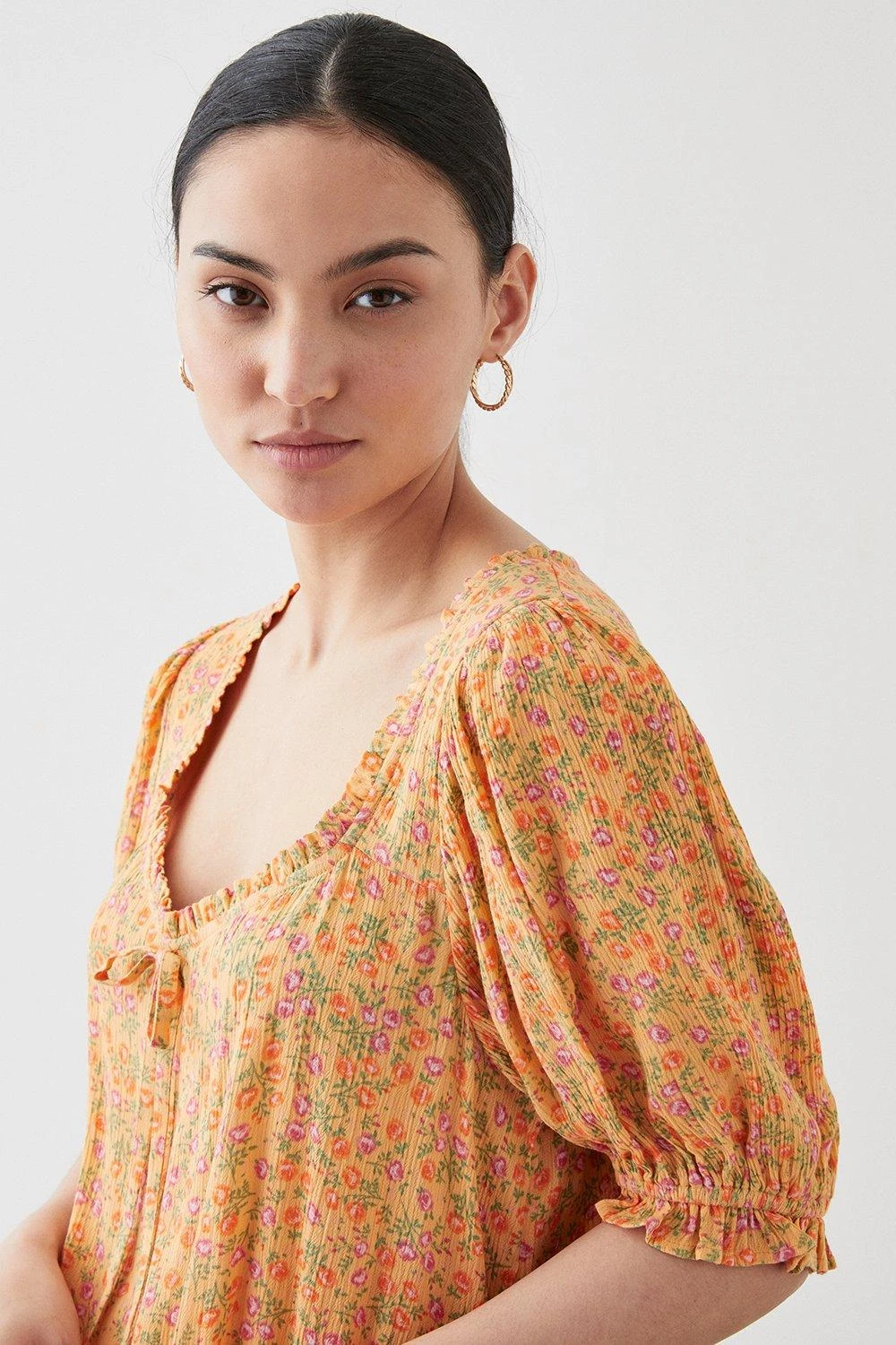 Cami or blouse? Shirt or bodysuit? Whatever you’re after, our women’s tops have you covered for every event in the social calendar. From casual fits to elevated styles for special occasions, we make it easy to nail the ‘jeans and a nice top’ look. Think puff sleeves, pretty prints, wrap silhouettes and so much more. Style: Petite Yellow Ditsy Crinkle Square Neck Blouse. Ideal for: Daywear. Design: Tie. Model wears size UK 10 and is 5′ 3″ tall. Make-up & Fragrance: Primer (Estée Lauder, The Mattifier Shine Control Perfecting Primer + Finisher), Foundation (Lancôme, Teint Miracle Luminous Satin Foundation), Mascara (Estée Lauder, Double Wear Zero-Smudge Lengthening Mascara), Blusher (Benefit, Wanderful World Blushes Starlaa Rosy Bronze Powder Blusher), Setting Spray (Benefit, Porefessional Super Setter Setting Spray Mini 30ml), Fragrance (Elie Saab, Elixir).This garment is READY FOR THE FUTURE.Recycled fibres can be used for a number of materials including polyester, cotton and acrylic. They are a more sustainable alternative, as they take less energy, land and water to make than virgin fibres, and are often derived from products that would otherwise have gone to wasteFind out more about our sustainability guidelines and goals.