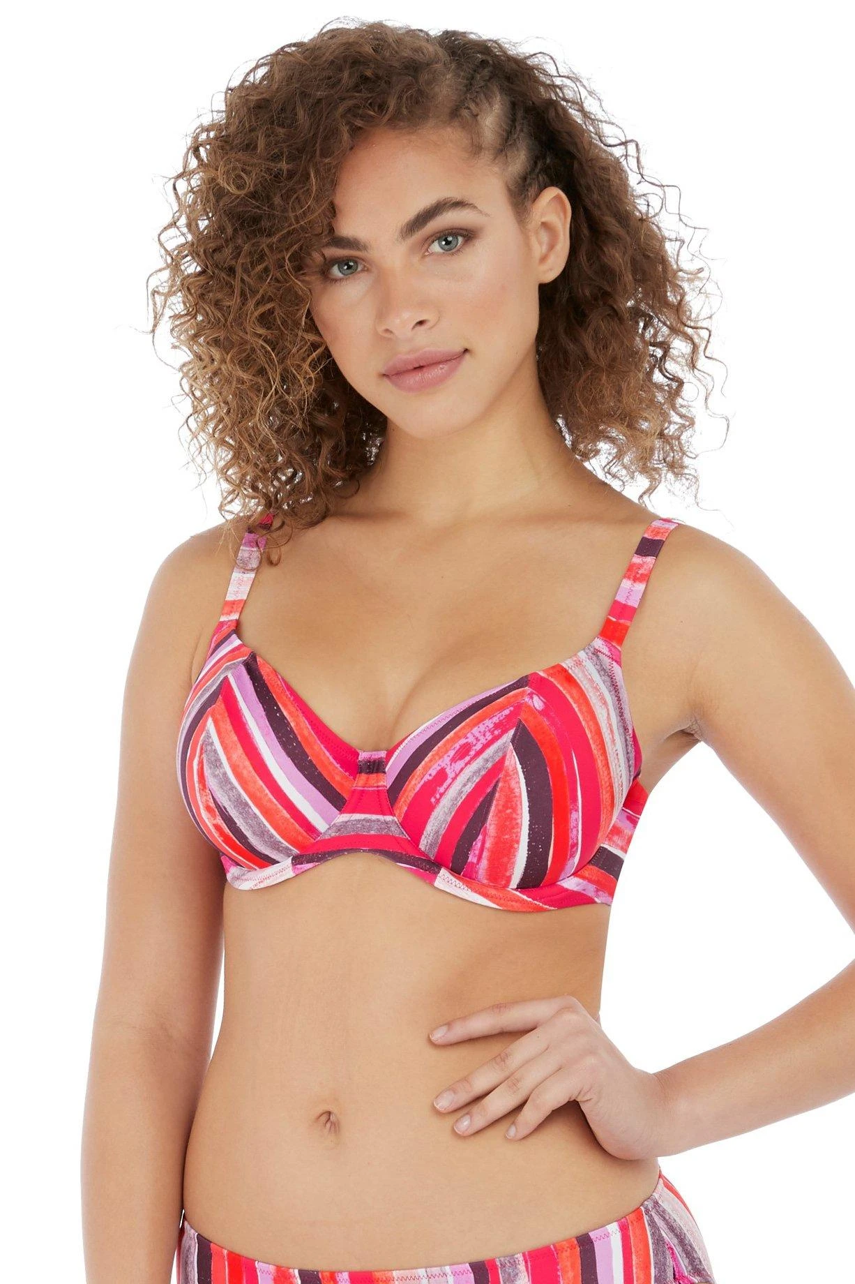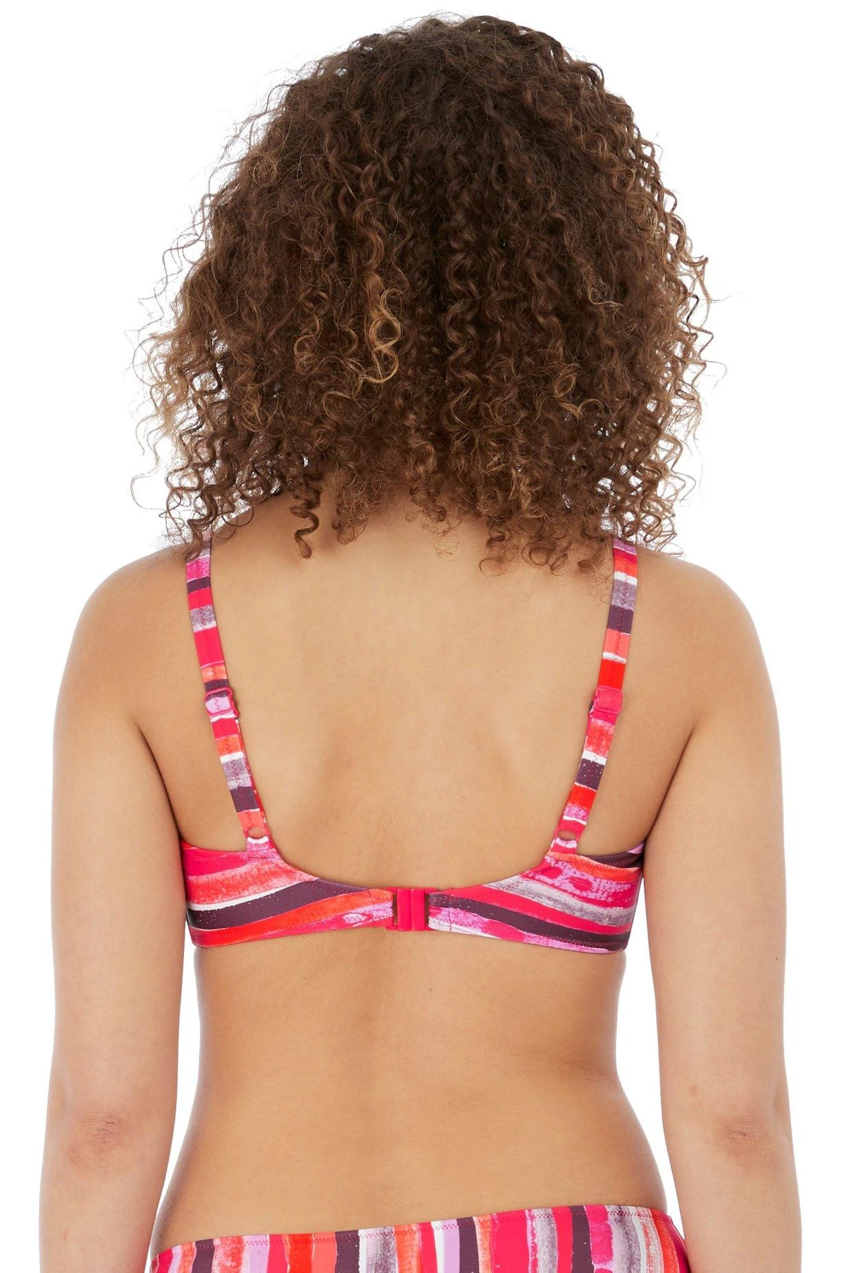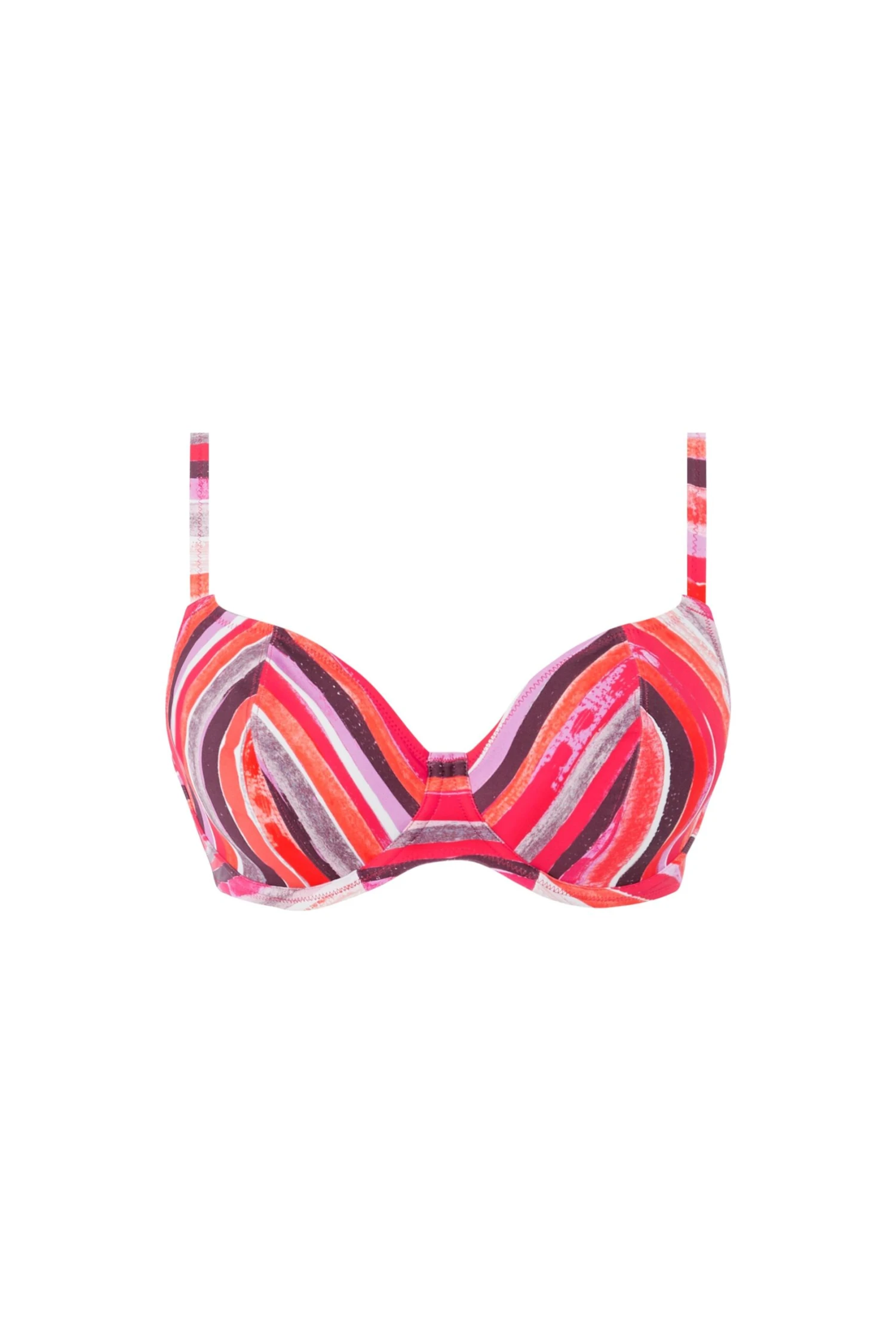 A striking hand painted stripe design in peachy, purple and pink tones. The Plunge Bikini top has a low neckline and under-wired lined cups for shape and support with fixed fully adjustable shoulder straps.